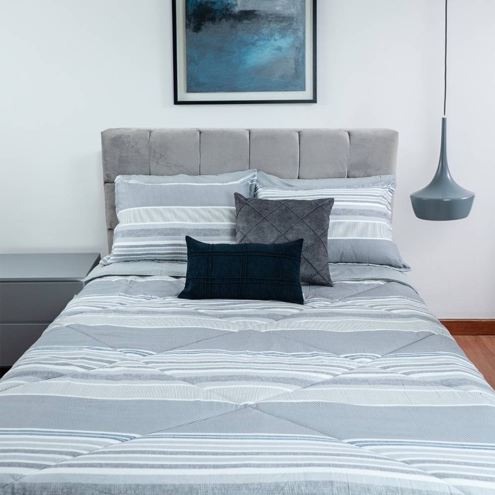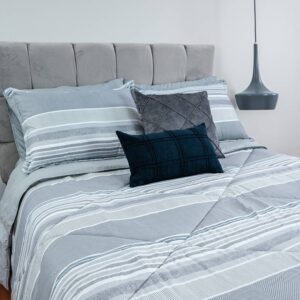 Escápate a la calma con este edredón de diseño a rayas horizontales en tonos celestes y grises , Disfruta de la máxima comodidad mientras añades un toque de distinción y frescura a tu refugio personal. Incluye 1 funda para la talla Twin y 2 fundas para las tallas Full, Queen y King.
